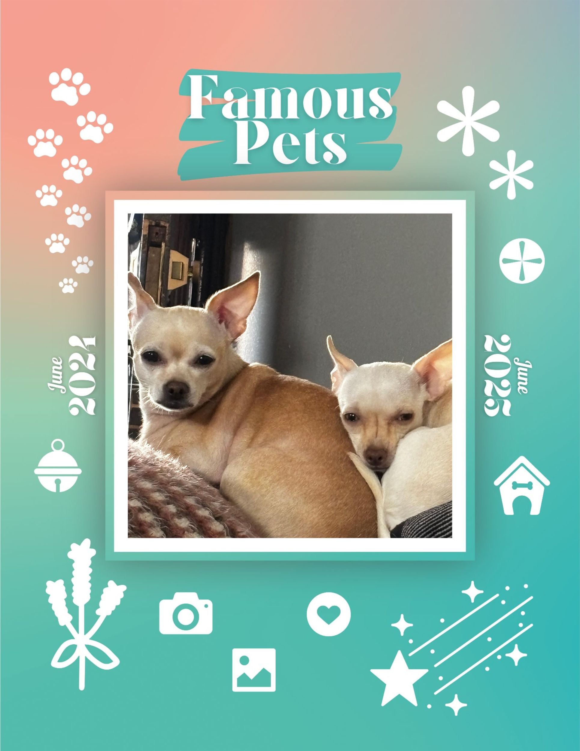 Step into a year of cherished moments with our Famous Pets Calendar, where Luna & Annie graces the cover and a special month-page, shining as the star of your year.